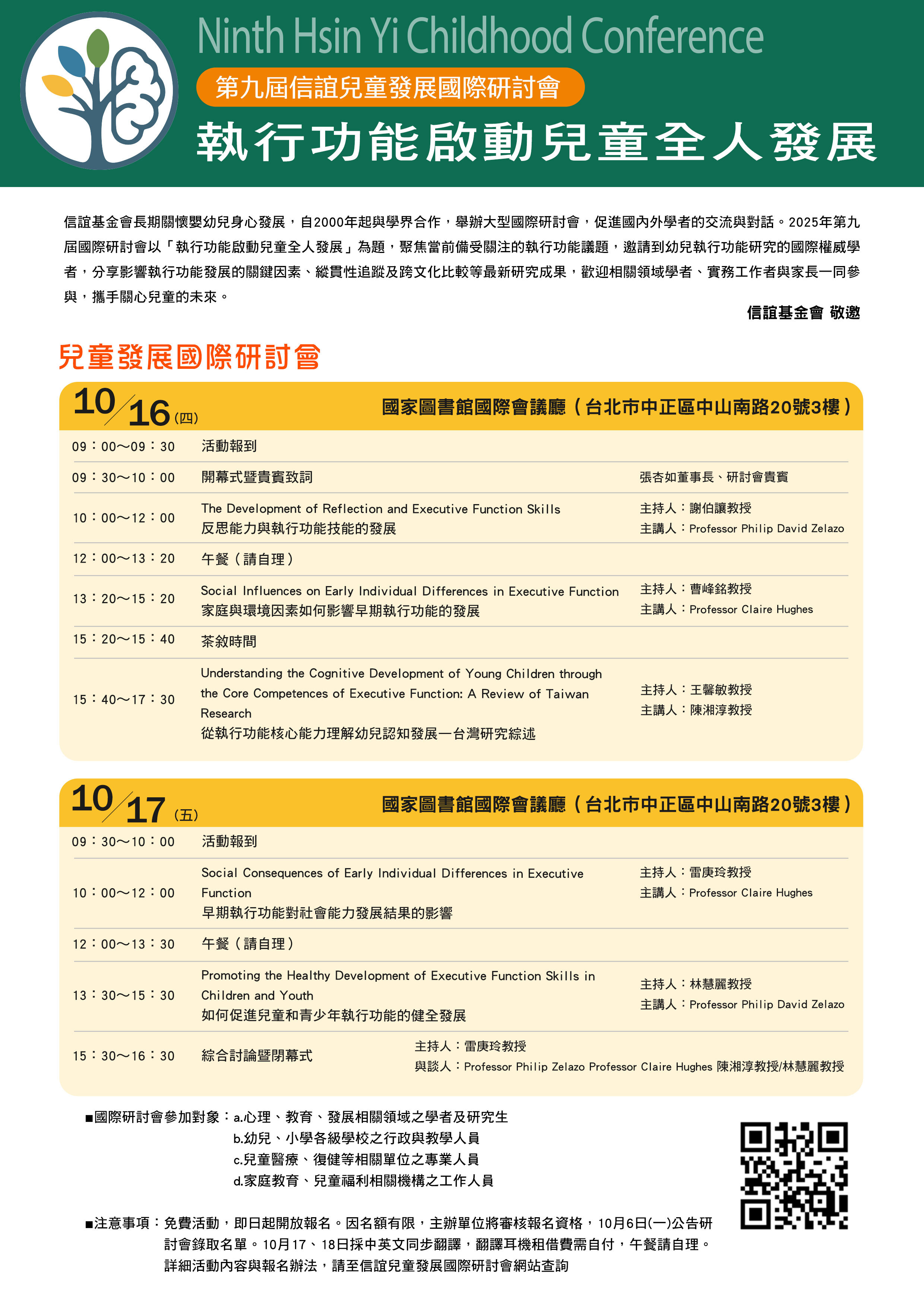 二、 第九屆信誼兒童發展國際研討會將於114年10月16日至17日舉行。近年來,兒童執行功能(Executive Function, EF)已成為發展心理學與認知神經科學領域的重要研究議題,因此,本屆以「執行功能啟動兒童全人發展」為核心,邀請美國明尼蘇達大學Philip David Zelazo教授、英國劍橋大學Claire Hughes教授,以及清華大學陳湘淳教授擔任主講人,期能帶動國內學界與醫界逐漸起步的相關研究,並激發更多新知與啟發。